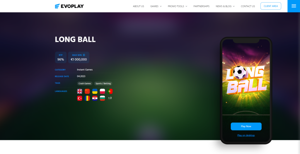 Long Ball est un jeu de crash conçu par le développeur Evoplay. Mis en ligne le 11 mai 2023, il a été développé sous le thème de sport et plus précisément sur le foot. Long Ball a une volatilité moyenne pour un RTP équivalant à 96 %.