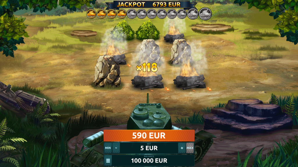 Pour démarrer un tour de jeu, il faut au préalable faire un pari et actionner le bouton Jouer. La partie prend fin automatiquement si vous réussissez l’exploit de détruire 4 chars de guerre sur l’écran. Pour ce faire, dès le démarrage du jeu, vous devez tirer sur le buisson ou le rocher. Dès que 4 chars détruits apparaissent à l’écran, vous gagnez la partie. Il faut dire qu’à chaque fois que vous détruisez jusqu’à 4 chars, votre mise est multipliée par 118.