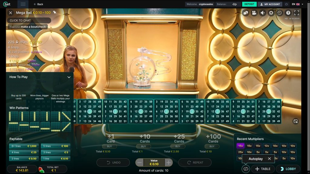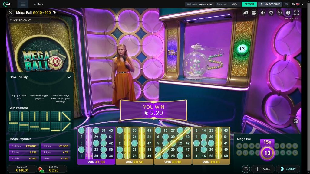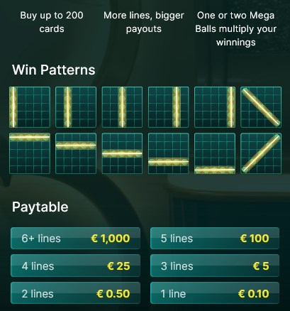 Les paiements de Live Mega Ball sont par carte. Vous devez avoir plusieurs lignes gagnantes sur une carte pour obtenir les gros gains.