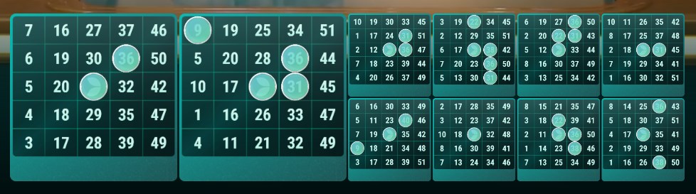 - La liste des numéros nécessaires pour compléter les lignes gagnantes est également affichée en or sur le dessus des cartes.