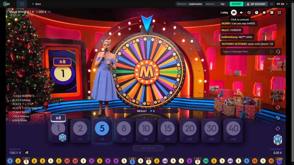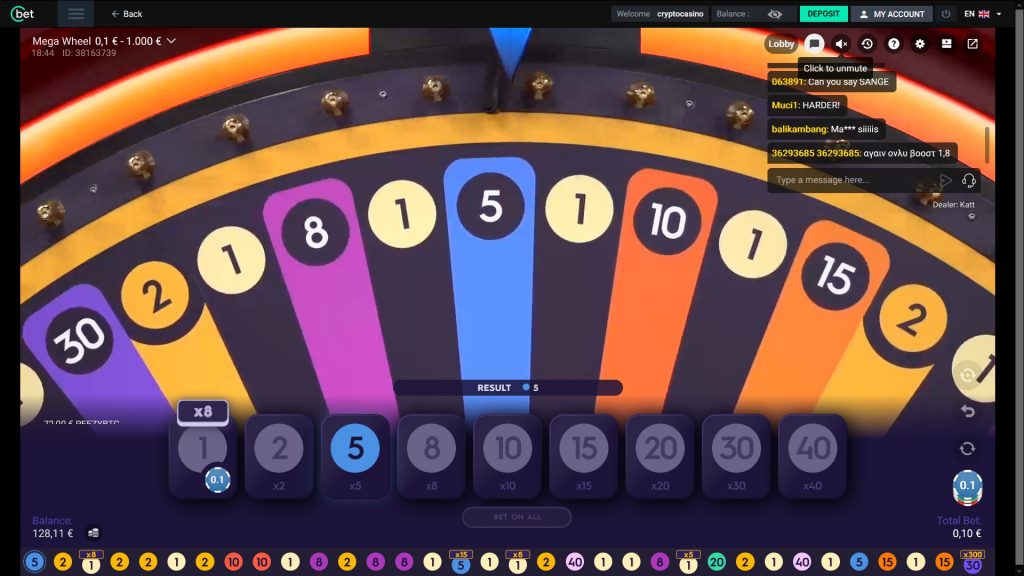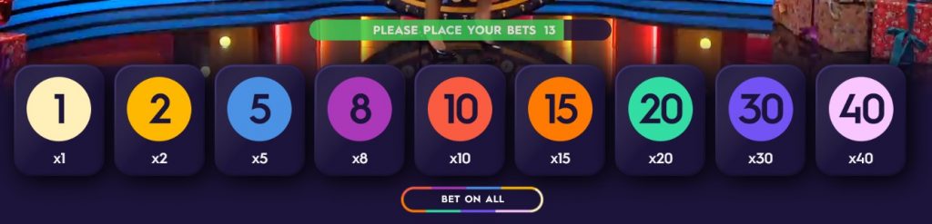 Mega Wheel se joue sur une roue colorée à 54 segments. Il y a neuf numéros différents sur cette roue : un, deux, cinq, huit, dix, quinze, vingt, trente et quarante. Notre but en tant que joueurs est de prédire quel numéro sera tiré par la roue, et de miser en conséquence. Vous disposez d’une brève période de pari pendant laquelle vous pouvez décider des numéros que vous voulez jouer.