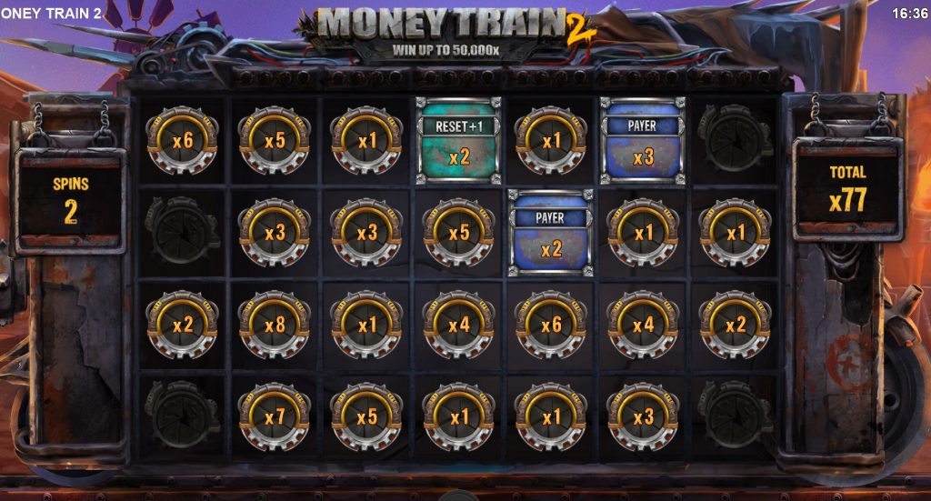 Money Train 2 propose une fonction de rechargement dans le jeu de base. Elle s’active lorsque vous obtenez 2 symboles bonus normaux sur les rouleaux. Le jeu ajoute les multiplicateurs des symboles bonus et les affiche sur le côté. Vous obtiendrez alors un respin jusqu’à ce que vous obteniez une combinaison gagnante. Chaque tour qui n’aboutit pas à un gain ajoute un multiplicateur à votre total.