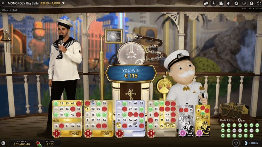 Lorsque vous avez placé vos mises et que Monsieur MONOPOLY tire sur le levier pour mettre en marche la distributrice à boules, la partie se lance et c’est là que le fun commence. Comme sur un jeu de Bingo traditionnel, pour gagner sur Monopoly Big Baller et de valider le plus de numéro sur votre carte afin de compléter le plus de lignes possible. Quand le numéro d’une boule tiré se trouve sur l’une de vos cartes, il sera automatiquement coché.