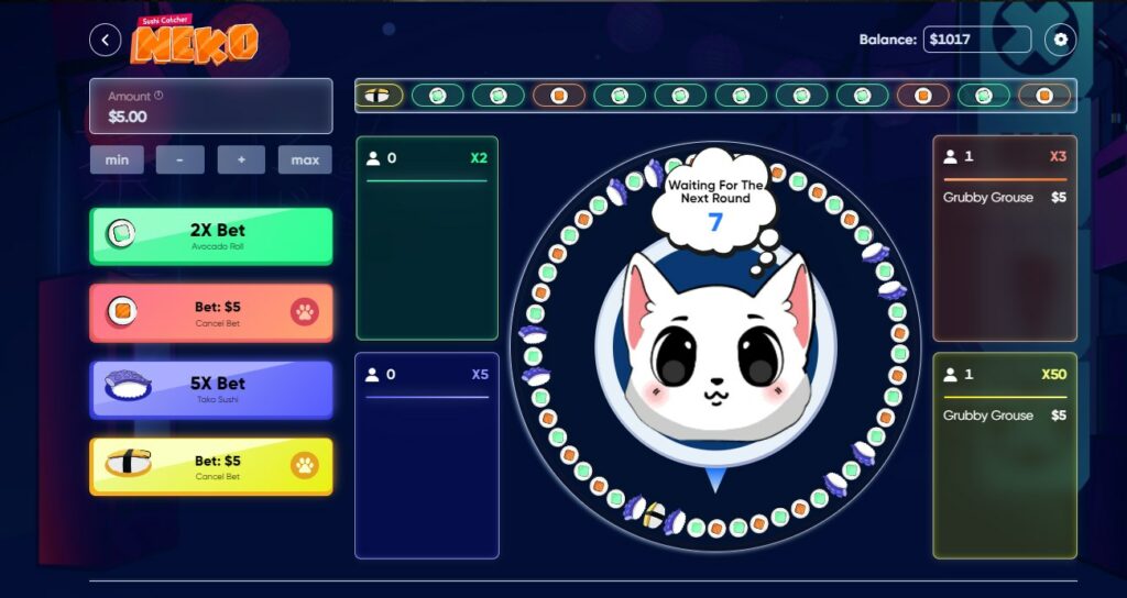 Après Towers et le Jeu du chien, Casinozer nous propose une roulette sous forme de mini-jeu. Le jeu se présente de cette manière : un petit chat se trouve au milieu et la roue tourne. L’enjeu est simple : choisir le bon sushi sur lequel la roue va s’arrêter.