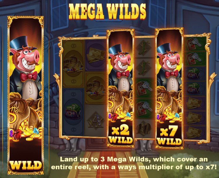 L’écran du jeu présente un manoir du style bourgeois avec un élégant et prestigieux tapis rouge au milieu. Il aborde une thématique d’opulence, de luxe et de haute société représentée par une grande villa aux finitions subtiles. La machine à sous Piggy Riches Megaways comporte six rouleaux et chaque grille contient jusqu’à sept symboles. Pour gagner, vous devez aligner au minimum trois de ces derniers, mais deux si vous trouvez le sac d’argent et de bijoux.