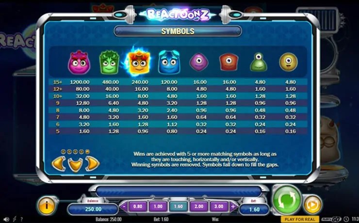 Formez une grappe d’au moins cinq symboles correspondants dans la machine à sous vidéo à sept lignes et sept rangées et vous commencerez à gagner des gains, c’est ainsi que fonctionne la forme de vie extraterrestre dans Reactoonz.
