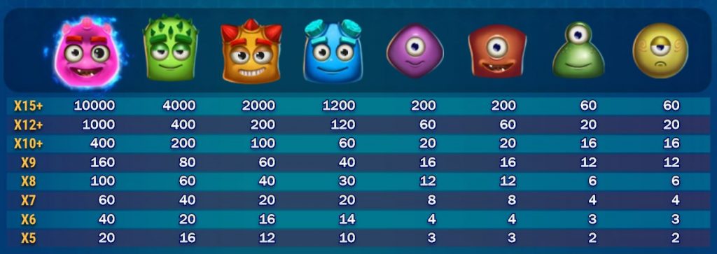 Parmi les personnages qui apparaissent, on trouve 4 petits Reactoonz et 4 plus grands, le symbole le plus rémunérateur étant le personnage rose de Reactoonz. Faites atterrir 15 d’entre eux ou plus sur la même combinaison et recevez 500x votre mise totale.