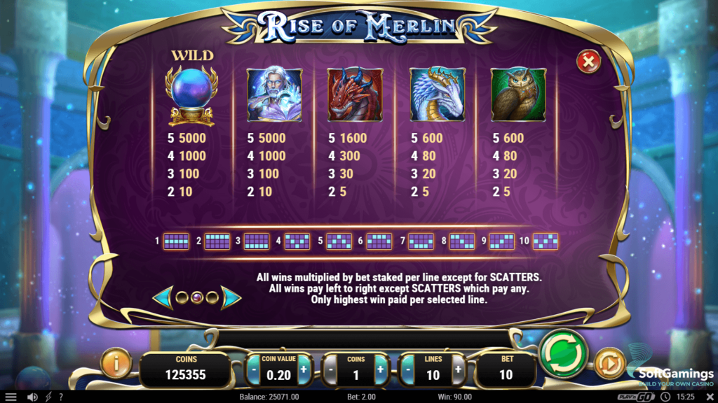 Il vous faudra aligner de 2 à 5 symboles similaires sur une ligne pour déclencher un gain. Wild et Merlin, vos alliés magiques, peuvent compléter n’importe quelle rangée et améliorer vos chances de victoire. À vous de laisser libre cours à votre veine et de profiter de l’expérience Rise of Merlin !