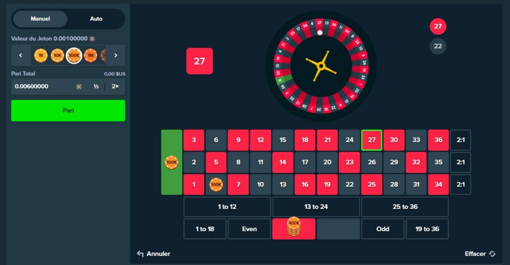 Vous pouvez regarder cette stratégie sur la Roulette de Stake en vidéo. Elle ne vous fera pas gagner à tous les coups mais permet de s’amuser plus longtemps.