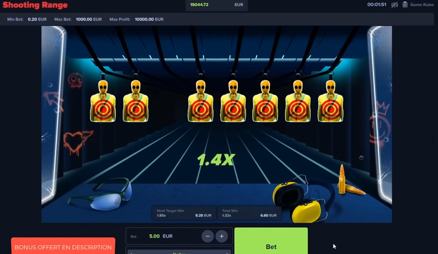 Ce bonus vise à booster vos premiers pas sur la plateforme, notamment avec le jeu phare Shooting range, vous offrant ainsi un coup de pouce indispensable pour bien démarrer.