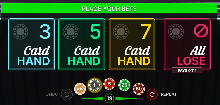Le croupier procédera alors à la distribution des cartes. Il tirera d’abord trois cartes pour les paris de la main à trois cartes. Si vous avez placé un pari ici et qu’une main gagnante est formée, vous recevrez le gain immédiatement. Pendant ce temps, le croupier tirera deux autres cartes pour une main de cinq cartes, et deux autres après cela pour une main de sept cartes. Tous les gains sont attribués immédiatement après avoir été tirés, à l’exception de « All Lose ». Il doit attendre la fin du tour, et ne paie que si aucune des trois autres options n’a été gagnée.