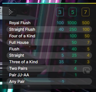 Pour les mains à trois cartes, vous obtenez 40:1 pour une quinte flush, 4:1 pour une flush standard, 5:1 pour une quinte, 35:1 pour un brelan et 1:1 pour une paire. Les mains de cinq cartes vous donnent 250:1 pour une quinte flush, 100:1 pour un carré, 50:1 pour un full, 40:1 pour une quinte flush, 25:1 pour une quinte flush, 7:1 pour un brelan, 4:1 pour deux paires et 1:1 pour les paires JJ-AA. Enfin, les mains de sept cartes rapportent 100:1 pour une quinte flush, 50:1 pour un carré, 7:1 pour un full, 5:1 pour une quinte flush, 4:1 pour une quinte et 3:1 pour un brelan. Tous perdent des filets vous 0,7:1 lorsqu’ils sont gagnés.