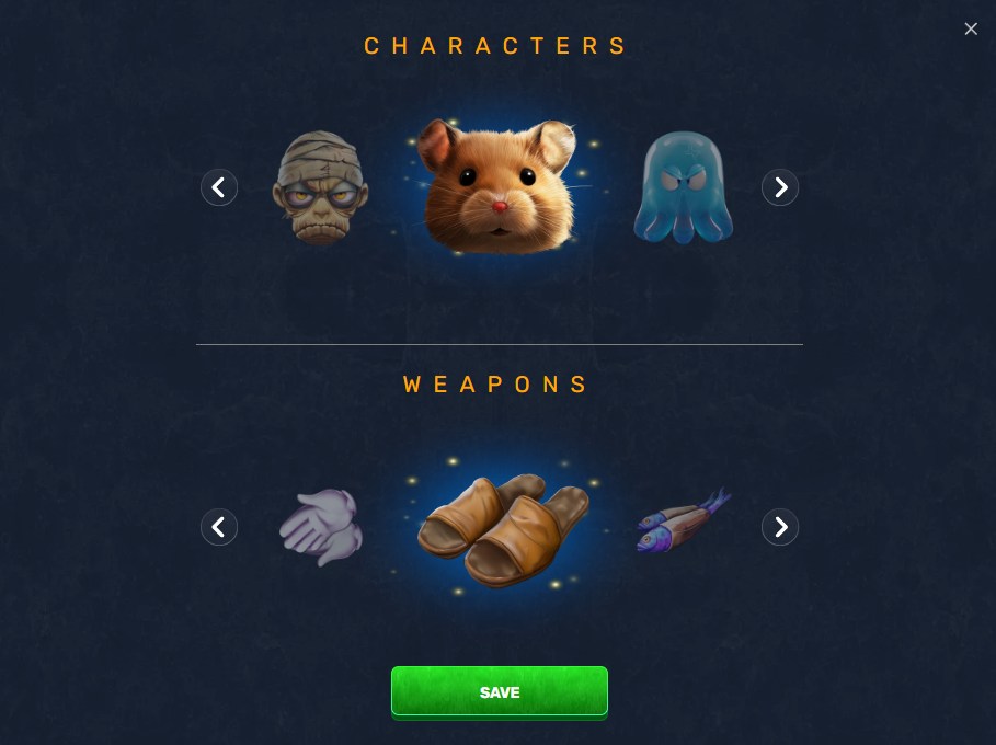Les joueurs peuvent choisir parmi cinq personnages différents tels que Scream, Hamster, Momie, et Pieuvre.