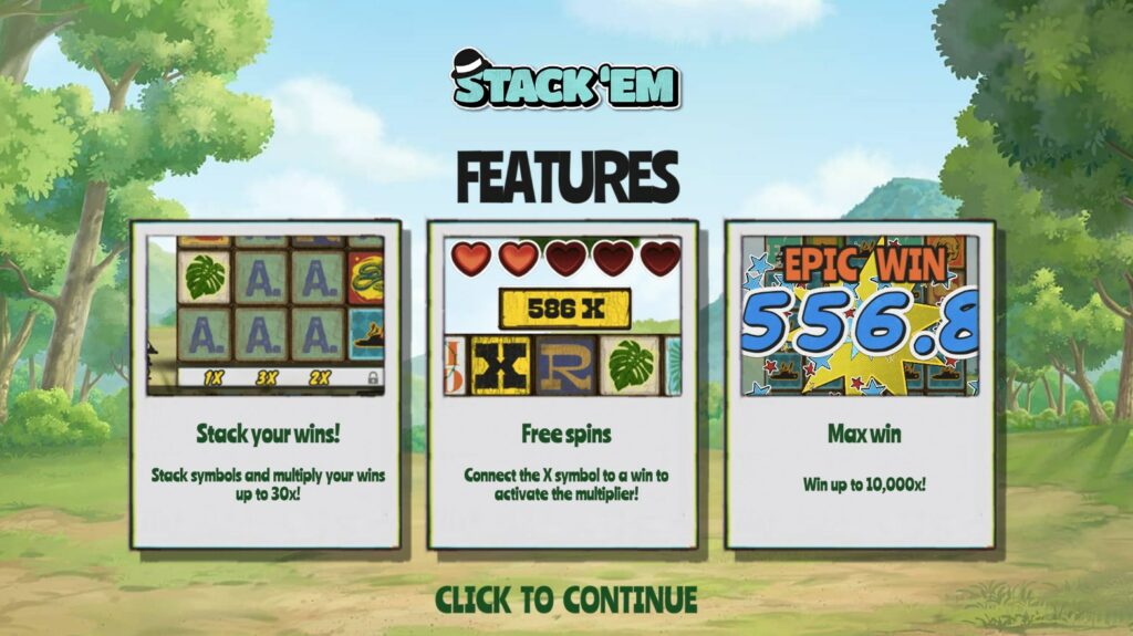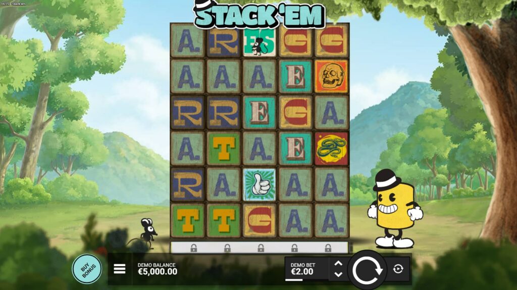 La machine à sous Stack’em est conçue sur la base d’une matrice inhabituelle, en l’occurrence cinq rouleaux et six rangées. C’est un mécanisme du style cascade en jeu, donc vous avez la possibilité d’empiler vos gains. Lorsque des clusters sont formés, les autres symboles non gagnants sont supprimés de l’écran et les symboles victorieux tombent vers le bas. Pour rappel, le niveau RTP de la slot est de 96 % et le gain maximum est de 10 000 x par tour.