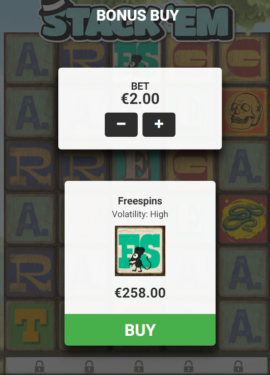 Le développeur a également doté la slot Stack’em de la fonctionnalité d’achat de bonus qui garantit de bonnes perspectives de gain. Elle coûte 129x le montant du pari initial et constitue une option pour les joueurs qui n’ont pas le temps d’attendre les trois symboles scatter. Par ailleurs, la machine à sous Stack’em est conçue avec la fonctionnalité d’autoplay pour vous permettre de lancer jusqu’à 1 000 tours automatisés.