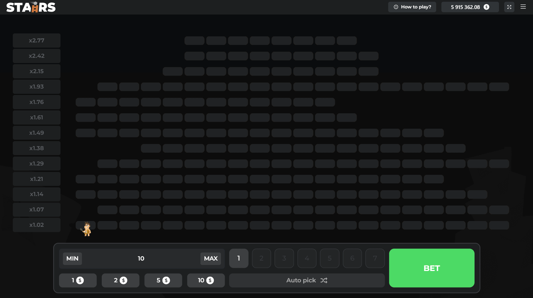 Pour jouer à Stairs, commencez par sélectionner votre mise, choisissez le nombre de rochers (entre 1 et 7) et tentez de grimper le plus haut possible sans tomber sur un obstacle.