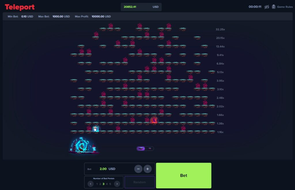 Teleport est un mini-jeu d’escalier ou vous pouvez modifier différents paramètres avant de lancer votre partie. Pour ceux qui sont familiers avec Fury Stairs, un mini-jeu disponible sur Casinozer, le principe de Teleport est le même.