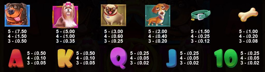 Certains symboles sont assez cartoon et ont un aspect amical, tandis que d’autres sont colorés. Le meilleur d’entre eux est le Rottweiler – il paie 2,5, 7,5 ou 37,5 fois votre mise totale si vous faites apparaître 3, 4 ou 5 symboles sur une ligne de paiement. Les récompenses dans ce jeu sont payées comme suit :