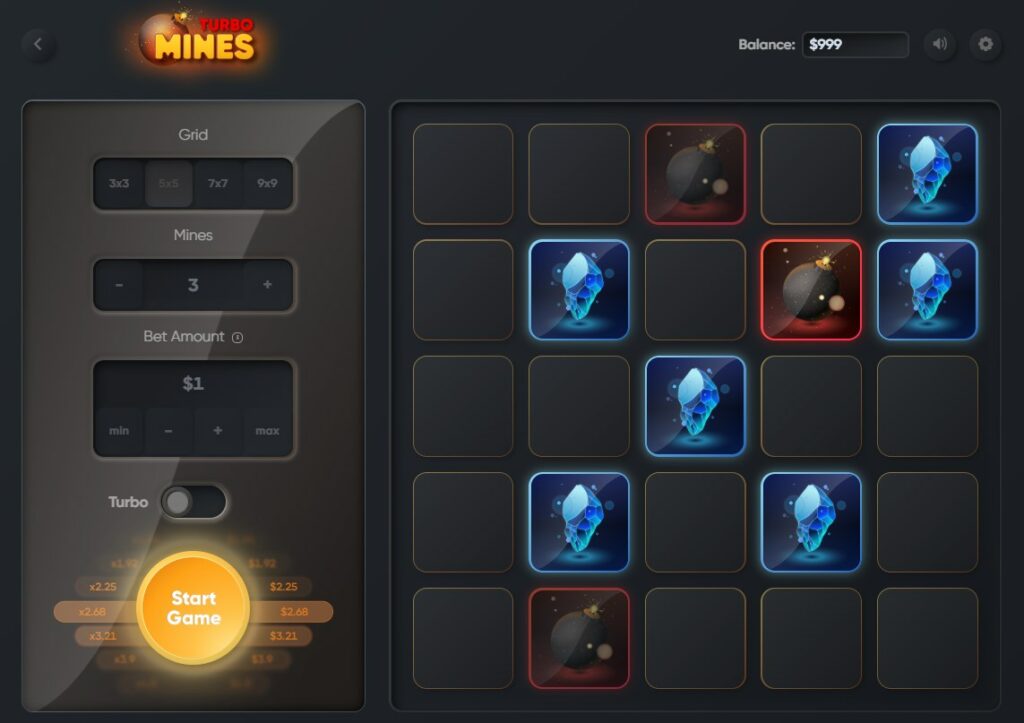 Turbo Games à tenter de faire évoluer la formule classique des jeux mini-jeux casino de mines avec Turbo Mines tout en restant fidèle à la formule de base.