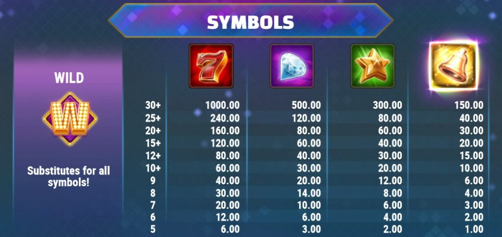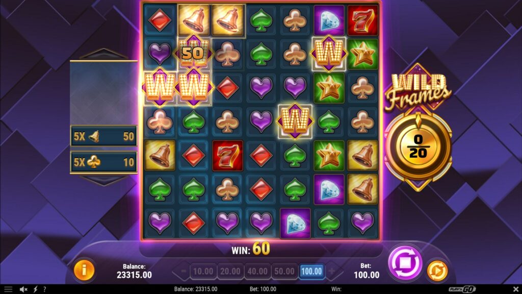 Wild Frames se déroule sur une grille 7×7, et les joueurs créent des combinaisons gagnantes en faisant apparaître des symboles par groupes de cinq ou plus. Les gains sont très généreux, et le symbole le plus rémunérateur est le 7, qui offre un prix de 500x lorsque vous en faites apparaître 30 sur les rouleaux.