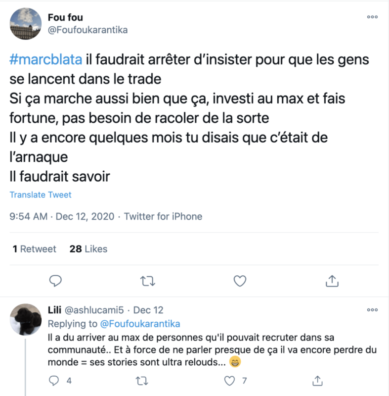 Marc Blata est au centre de plusieurs polémiques notamment à cause de son Telegram de Crypto-Trading où il promeut la pratique de Copy trading. Le Copy Trading permet à des amateurs en trading ou en Crypto trading d’automatiquement suivre les positions ouvertes d’autres individus. Cependant, d’après de nombreux avis sur internet, plusieurs personne ont perdu une fortune en suivant ses « positions ».