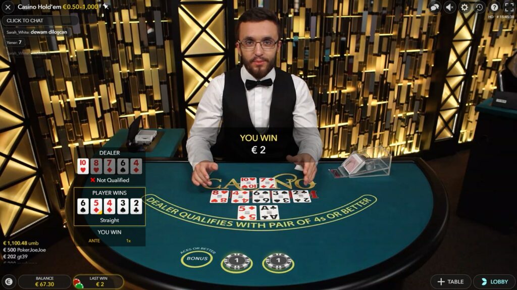 Le Live Casino Hold’em est une variante du Texas Hold’em à cinq cartes qui a été mis au point par Evolution Gaming. Il incorpore les meilleures fonctionnalités du jeu original tout en en se démarquant pour les amateurs de poker en ligne.