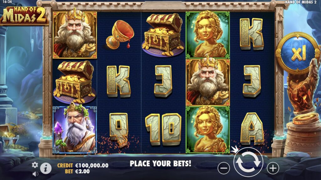Dans « Hand of Midas 2 », Pragmatic Play offre une suite captivante où le roi Midas continue de transformer tout ce qu’il touche en or. Le jeu est imprégné de luxe et de richesse.